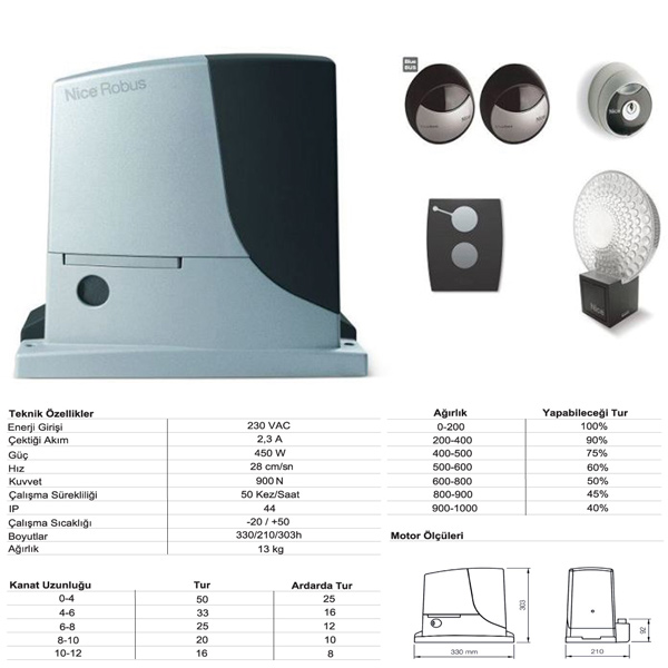 Nice Robus 1000 motor ağır yüklerin altından kalkmak ve yoğun kullanımlar için tasarlanmıştır. Birçok farklı alanda kullanılan Yana Kayar Kapılar için idealdir. Güçlü motoru ile en birçok görevin üstesinden kolayca gelmesi için ustalıkla üretilmiştir.